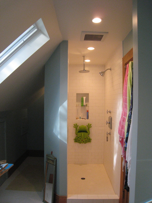 We took a unused area in the roof to fit in a extra long open shower, bath tub and two sinks. Great storage around the side and skylights that provide wonderful light and air circulation.